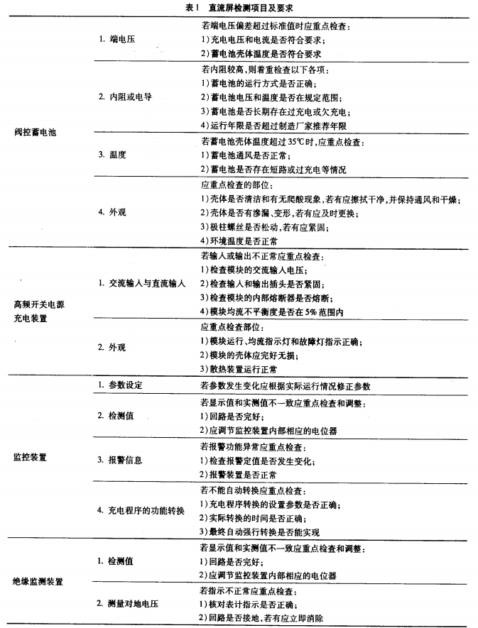 在建立完善的點(diǎn)檢制度之前,首要必須制定契合現(xiàn)場(chǎng)要求,并可以作為依據(jù)的設(shè)備檢修標(biāo)準(zhǔn)。在直流屏標(biāo)準(zhǔn)中規(guī)則了直流電源體系設(shè)備檢修的基本要求,檢修前的準(zhǔn)備、檢測(cè)項(xiàng)目、充放電試驗(yàn)等內(nèi)容。直流屏主要由蓄電池.高頻開(kāi)關(guān)電源充電設(shè)備,監(jiān)控設(shè)備、絕緣監(jiān)測(cè)設(shè)備4部分組成,見(jiàn)表1。