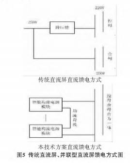 傳統(tǒng)直流屏控母和合母由于電壓不一致,負載要嚴格區(qū)分,比如 ,微機保護.指示燈等必須接入控母,斷路器分合閘、儲能電機等負載必須接人合母。本文所闡述的技術控母和合母的電壓等級一致,并聯(lián)輸出,可互用,方便用戶的使用。傳統(tǒng)直流屏、并聯(lián)型直流屏饋電方式,如圖5所示。