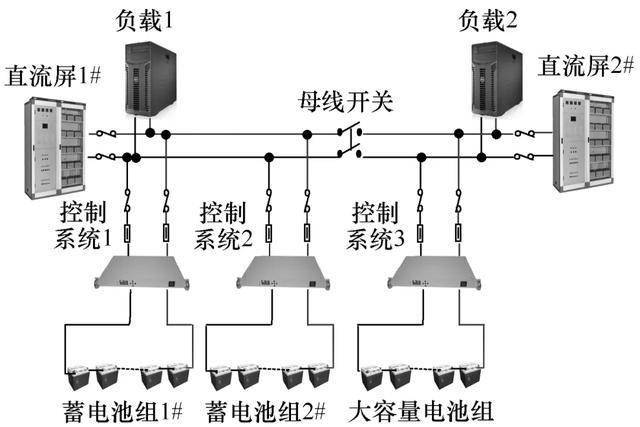 將原有的兩組蓄電池通過本文方法進行并聯(lián)使用,形成容量更大的蓄電池系統(tǒng)接入直流母線1將另一個大容量的新蓄電池組及相應的控制系統(tǒng)接入直流母線2。在運行幾年后,待原有的兩組蓄電池到了使用壽命后,再更換成新的大容量的蓄電池組,將提高蓄電池組的利用率,降低電池采購成本。