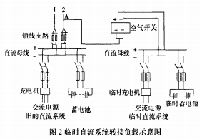 在對(duì)現(xiàn)場(chǎng)原有直流系統(tǒng)饋線網(wǎng)絡(luò)進(jìn)行仔細(xì)核對(duì)后,擬定了替換計(jì)劃,整體的替換思路是:建立一個(gè)簡(jiǎn)易的暫時(shí)直流系統(tǒng),使用暫時(shí)系統(tǒng)轉(zhuǎn)接負(fù)載。如圖2所示。