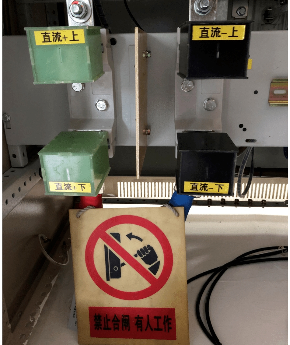 3. 取下蓄電池組保險(xiǎn)后,在蓄電池保險(xiǎn)的底座正極上下兩端、負(fù)極上下兩端別離套上大小適宜的絕緣盒,并在絕緣盒上別離掛“制止合閘,有人作業(yè)!”標(biāo)示牌。