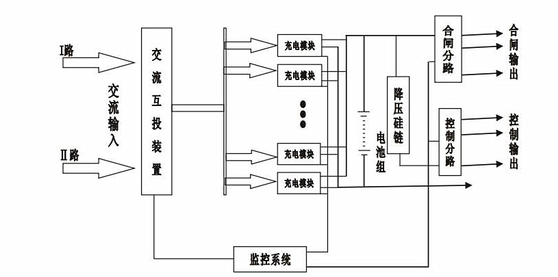 常規(guī)直流屏首要由溝通配電模塊、充電模塊、配電監(jiān)控模塊、降壓硅鏈等零件構成。如圖1為典型的直流屏結構體系。