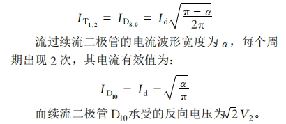 加了續(xù)流二極管后其輸出電壓波形V3與不加續(xù)流二極管時(shí)相同。原先流經(jīng)橋臂上元件的續(xù)流電流變成通過(guò)二極管續(xù)流。各原件中流過(guò)的電流波形和變壓器副邊電流波形明顯有必定的距離。每個(gè)周期中流過(guò)晶閘管T1、T2、D8、D9的電流波形寬度都是π—α,其電流有效值為(Id為負(fù)載電流)
